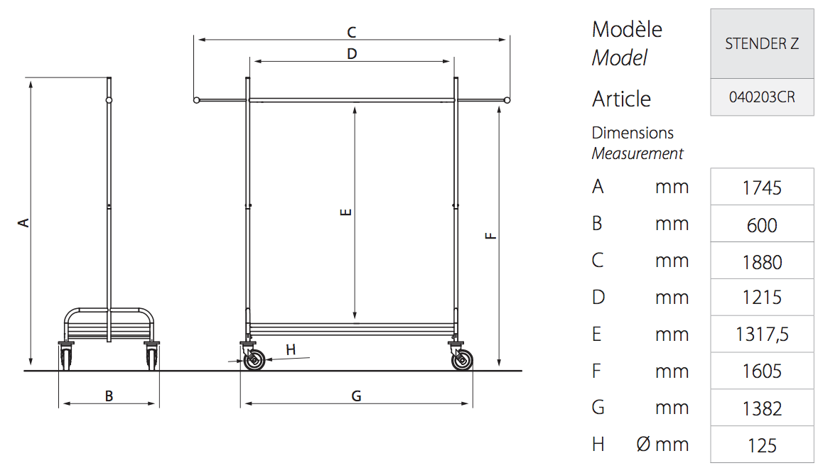 • Steel tube structure, base with dark gray coating • Chrome-plated wardrobe bar • 2 side extensions • Capacity 30-35 hangers • Nestable • 4 Ø125mm 'TPP' swivel castors with annular bumpers, 2 of which have brakes