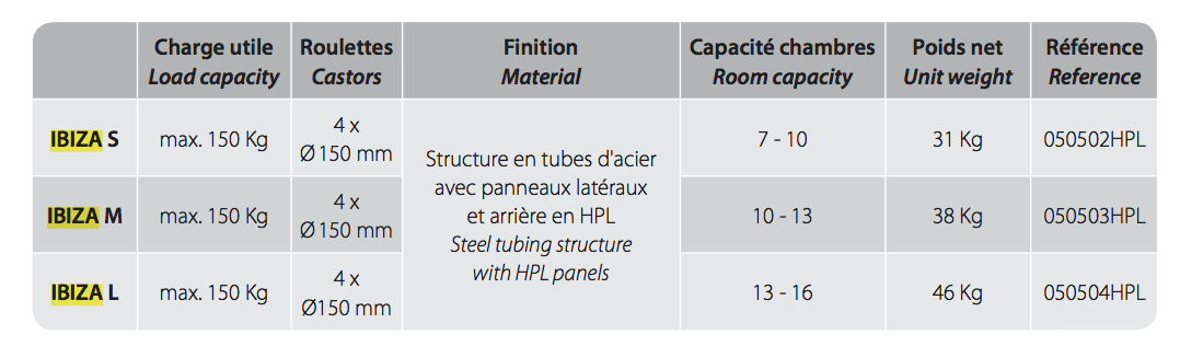 IBIZA is constructed in a practical manner, offering an excellent quality/price ratio. • Light and solid structure in steel tubes with light gray RAL 9006 paint coating • Side and rear panels in HPL (rot-proof, scratch-proof and unbreakable), 2 available finishes • 2 adjustable shelves • Integral non-marking bumper • Liftable top support for trash bag, 2 annular corner bumpers • Liftable top support for 127 L gray polyester (included) • Upper level with raised lip • 4 Ø150 mm 'CMP' swivel castors