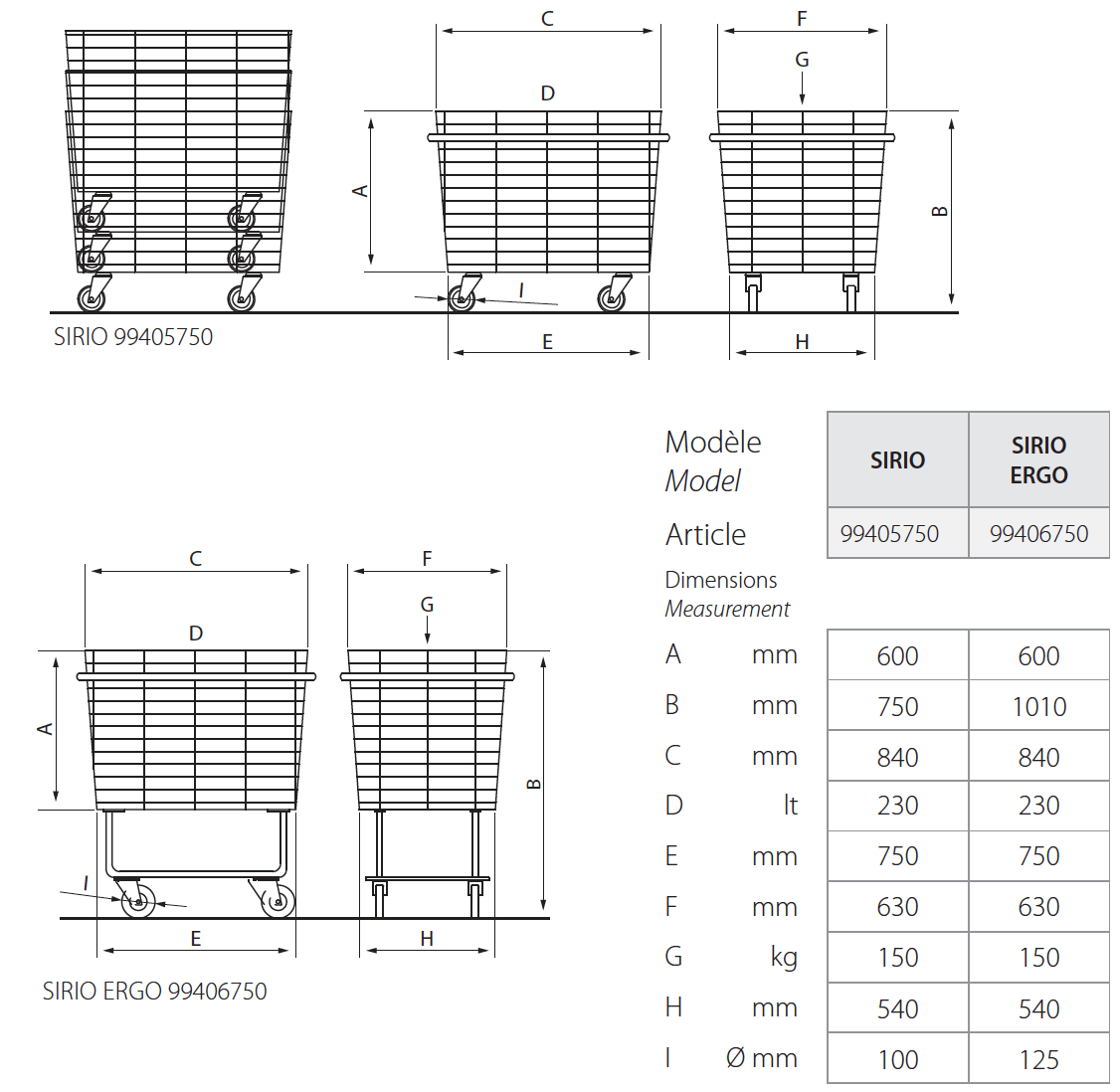 The maneuverability, quiet operation and solidity of SIRIOs make laundry rooms, floor corridors and swimming pool/fitness areas their favorite theaters of operation. Stackable thanks to their V shape. • Completely welded steel wire structure with white anti-corrosion epoxy coating• Capacity: 270Lt• Raised bottom for more ergonomics on SIRIO ERGO• Stackable• 4 swivel castors Ø100 mm 'CMM ' (SIRIO) 4 swivel castors Ø125 mm 'CMM' (SIRIO ERGO)