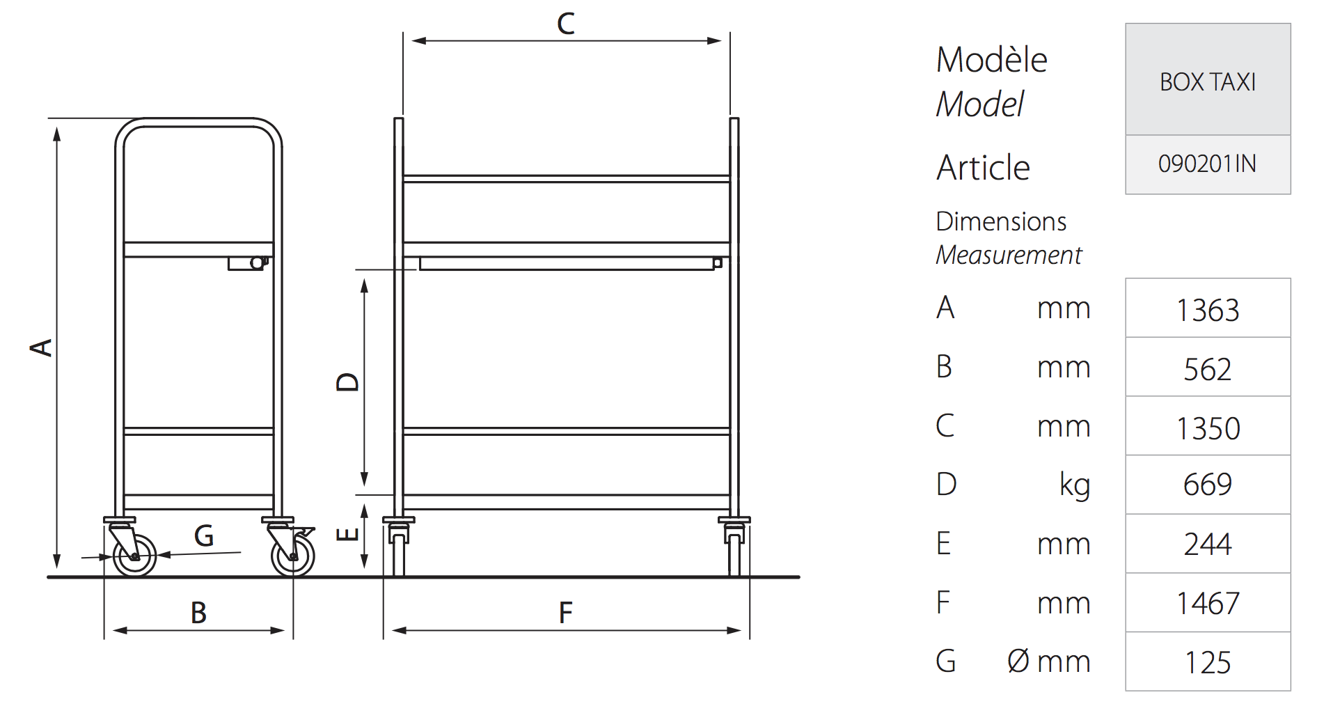 • Entirely made of stainless steel • 2 levels for a total capacity of 6 HOTBOXes • Power supply provided for simultaneous or individual heating of HOTBOXes with a single wall socket • 4 swivel castors of Ø125mm including 2 with brake, angular bumper