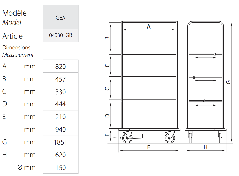 • Estructura ligera y sólida en tubo de acero con recubrimiento de pintura gris claro RAL 9006 • Paneles laterales y traseros en HPL (anti-putrefacción, rayado e irrompible), 3 acabados disponibles • Persiana enrollable con cerradura • Estantes regulables 2 niveles • 4 ruedas Ø150 mm 'CMP' • Parachoques integral que no deja marcas • 2 estantes laterales abatibles de acero y 2 parachoques de esquina anulares de ø100mm que no dejan marcas.