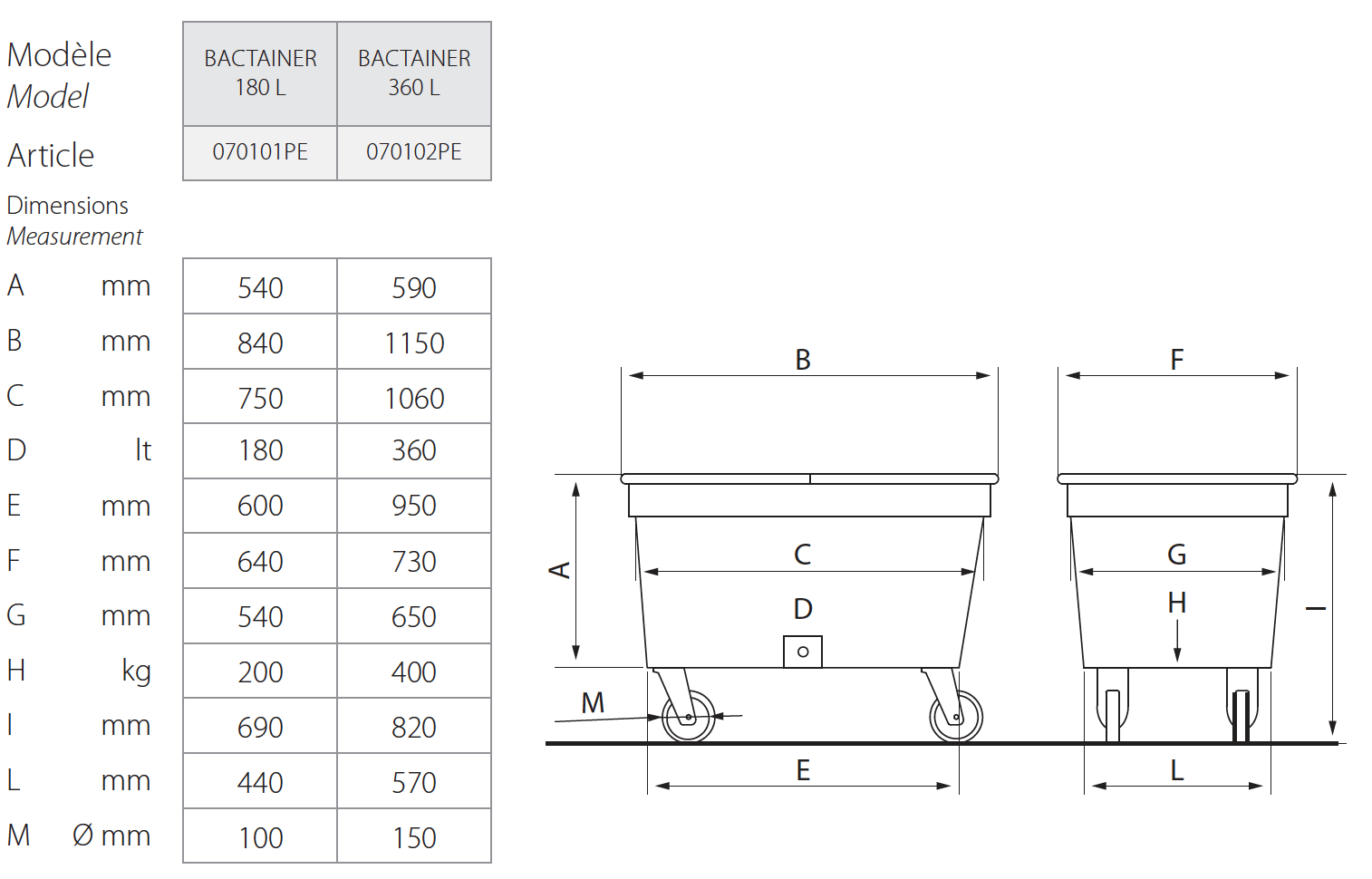 • 2 roulettes fi xes et 2 pivotantes Ø100 mm (180L) / Ø150 mm (360 L)