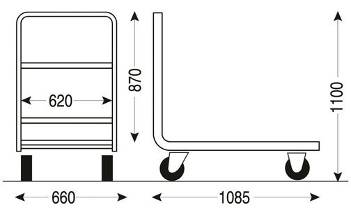 • Frame met 1 rangeerbrancard in eendelige ovale stalen buis Basis van waterdicht generfd multiplex • Toelaatbare belasting: 300 kg • Rubberen wielen Diameter 160 mm • Totale afmetingen in mm: L 660 x D 1080 x H 1090 • Coating Elektrolytisch verzinkt staal kleurloze vernis