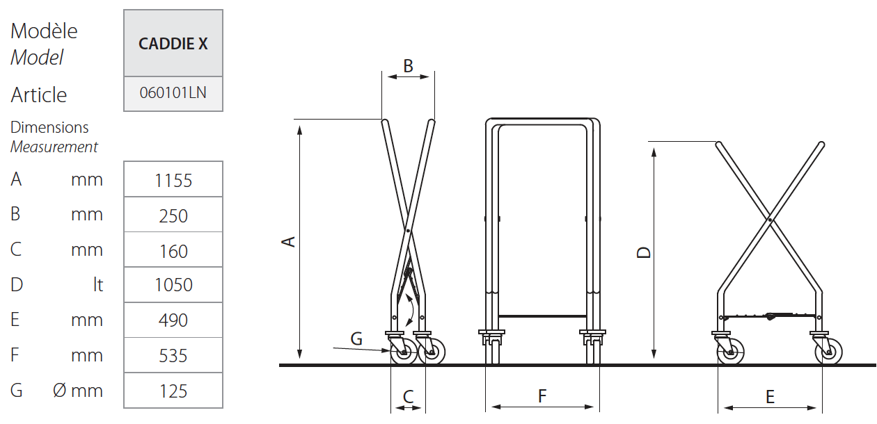 Royaal met een wastransportcapaciteit van 150 liter, maar ook compact als hij eenmaal is opgevouwen. • Opvouwbare structuur in stalen buizen, lichtgrijs geverfd RAL9006 • Anti-doorzakkende onderste steun in staaldraden • Inclusief een zak van 150 liter in grijs polyester. zwenkwielen Ø125 mm 'TPP' met ringvormige bumpers, waarvan 2 met rem