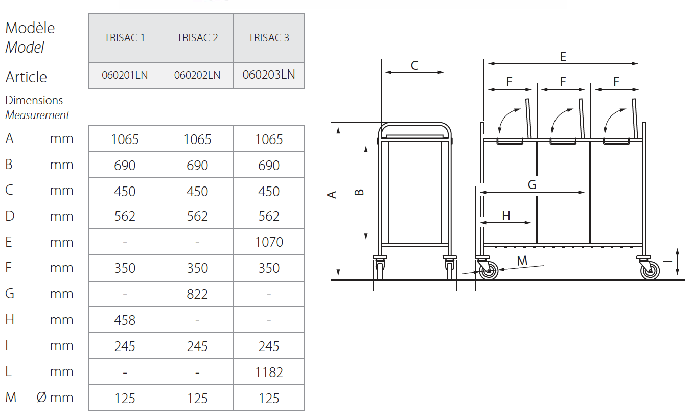 TRISAC helpt u bij het organiseren van de wasinzameling met maximaal 3 zakken van 87 liter • Stevige en lichte structuur in grijs gelakte stalen buizen • licht RAL9006 • Onderste steunframe met anti-doorzakkende metalen dwarsstukken • Inclusief 1, 2 of 3 zakken 87 liter verwijderbaar polyester • Deksel per tas • 4 zwenkwielen Ø125 mm 'TPP' met ringvormige stootranden, waarvan 2 met rem