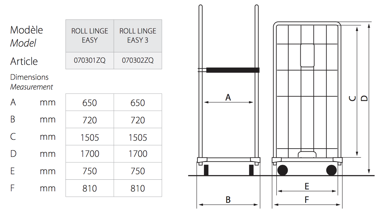 Onfeilbaar solide, veilig in gebruik, presenteren wij u de EASY WASSE ROL! Uitgerust met robuuste rubberen banden, is hij zeer gemakkelijk te manoeuvreren, zelfs als hij zwaar beladen is. • Structuur in gelaste stalen buizen en draden, elektrolytisch verzinkte afwerking • 2 verwijderbare panelen (EASY) / 3 verwijderbare panelen (EASY 3) • 2 spanners 2 haken (EASY) • 2 identificatieplaten • Gaas: 35x155 mm (basis) / 155x290 mm (zijpanelen) • 2 zwenkwielen en 2 vaste Ø125 mm