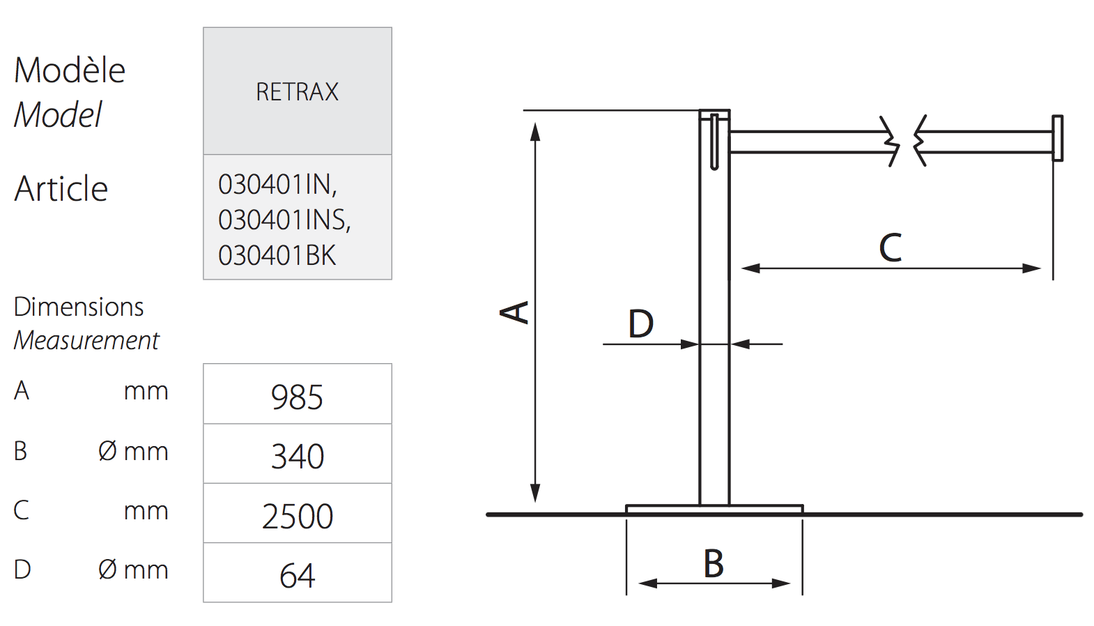 • RETRAX BK: Pied et poteau (Ø64mm), acier avec revêtement peint noir.